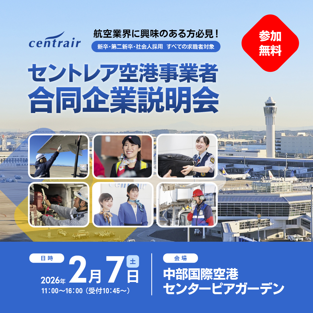 2025.12.24 セントレア空港事業者合同企業説明会に参加いたします🛫 合同企業説明会 詳細URL https://www.centrair.jp/info/recruit_seminar.html 日 時:2026年2月7日(土) 11:00~16:00(受付 10:45~) 参加費:無料 会 場:中部国際空港センターピアガーデン 皆様のご来場心よりお待ちしております! ※2025年2月開催の様子